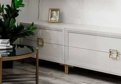 - Тумба ДЛ-352.07 с тремя выдвижными ящиками и тремя рамочными фасадами со вставкой ЛДСП 16 мм;