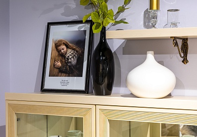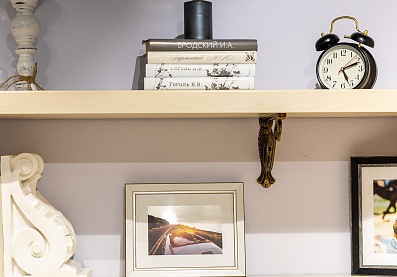 Сдержанная роскошь проявляется в деталях: элегантные латунные ручки, фрезерованные филенки, изящные витые менсолодержатели. Ручное патинирование придает фасадам налет старины, качественное лаковое покрытие устойчиво к выцветанию, не желтеет со временем. Надежная, продуманная фурнитура — петли с доводчиками, накладные демпферы, скрытые направляющие — превращает эксплуатацию гарнитура в истинное удовольствие.