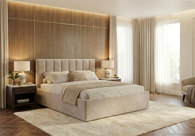 Мягкое, вертикально оформленное изголовье, выглядит современно и элегантно, визуально вытягивает пространство и делает интерьер более гармоничным. Обивка из велюра в универсальном оттенке легко вписывается в любой стиль — от минимализма и скандинавского до современного и неоклассики.